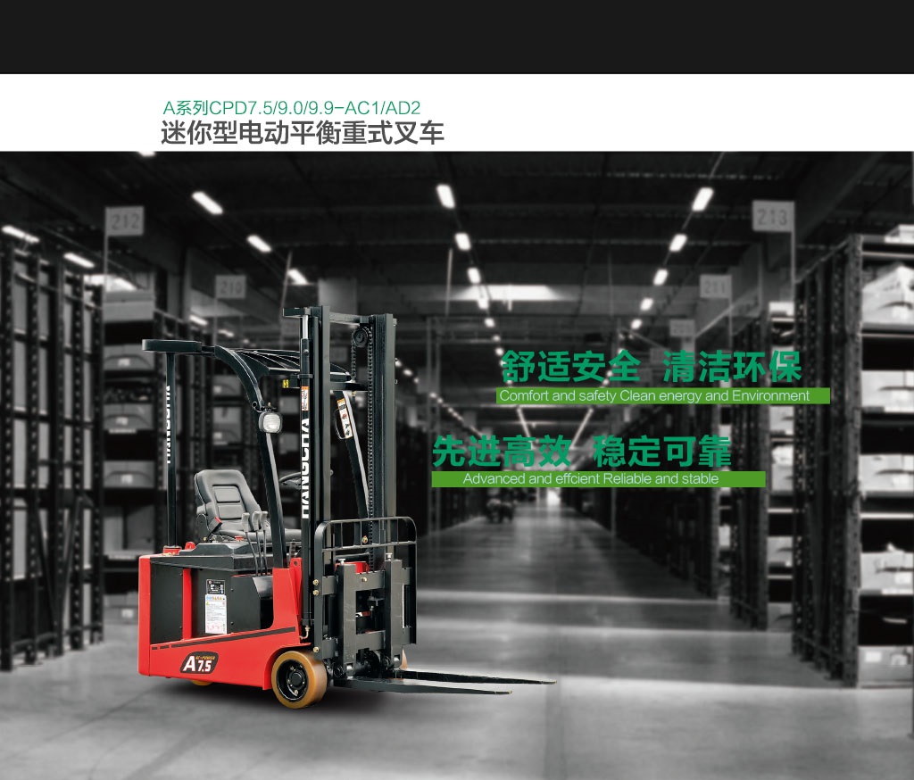 产品概述 PRODUCT BRIEF ●A系列 0.75-0.99t Mini迷你电叉——尺寸小、高效率的物流解决方案。A系列0.75t/0.9t/0.99t迷你电叉,是杭叉较小的电动平衡重式叉车。特别适合于轻工、电子,纺织等行业,应用于楼层之间/电梯上下搬运工作。自重轻,可连同货物进入普通货梯,转弯半径1.2米左右,可在狭小的空间内搬运、堆垛、转弯,是国内较小的电动平衡重式叉车。